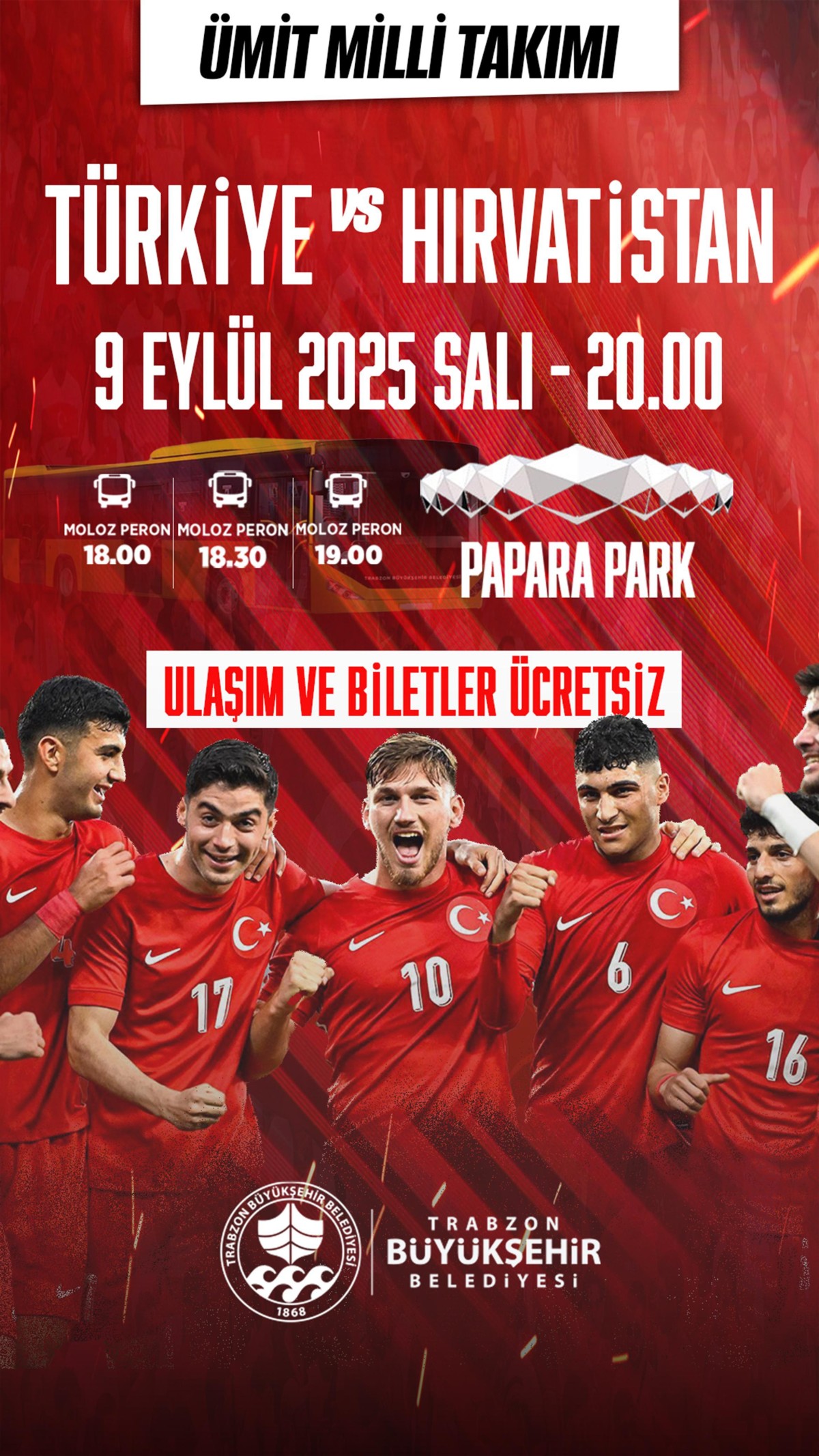 Trabzon Büyükşehir Belediyesi, Ümit Milli Takımı – Hırvatistan maçına ücretsiz otobüs seferleri düzenliyor.