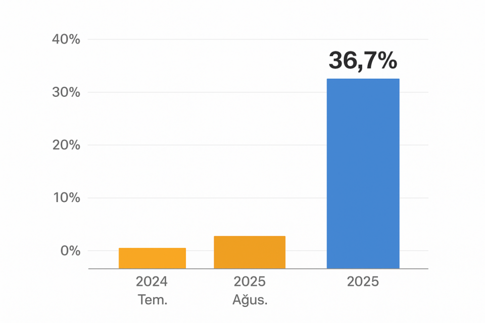 Türkiye İstatistik Kurumu (TÜİK) verilerine göre, sanayi, inşaat, ticaret ve hizmet sektörlerini kapsayan toplam ciro endeksi, 2025 yılı Ağustos ayında bir önceki yılın aynı ayına göre yüzde 36,7, bir önceki aya göre ise yüzde 2 arttı. Sektörler arasında en yüksek yıllık artış, yüzde 53,2 ile inşaatta gerçekleşti.
