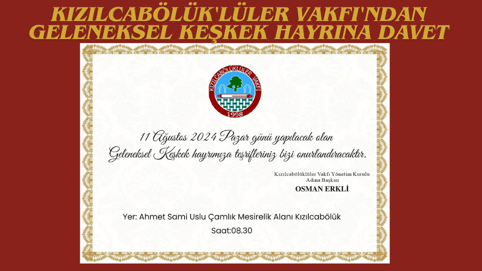 ‘‘Her yıl olduğu gibi bu yılda sekteye uğratmadan 11 Ağustos pazar günü gerçekleştirecek olduğumuz KEŞKEK HAYRINA Türkiye’nin her yerinden misafirlerimizi bekliyoruz, Kızılcabölük’e tanıma imkanları olacaktır. Kültürel Sosyal bir konumu olan Kızılcabölük Türkiye’de Marka Mahallelerden bir tanesidir, Tarih olarak çok eskilere dayanan çoğu yerde göremeyecekleri güzellikleri barındıran, doğayla içiçe vakit geçirebilecekleri konumda, Mesirelik alanında Gerçekleşecektir.