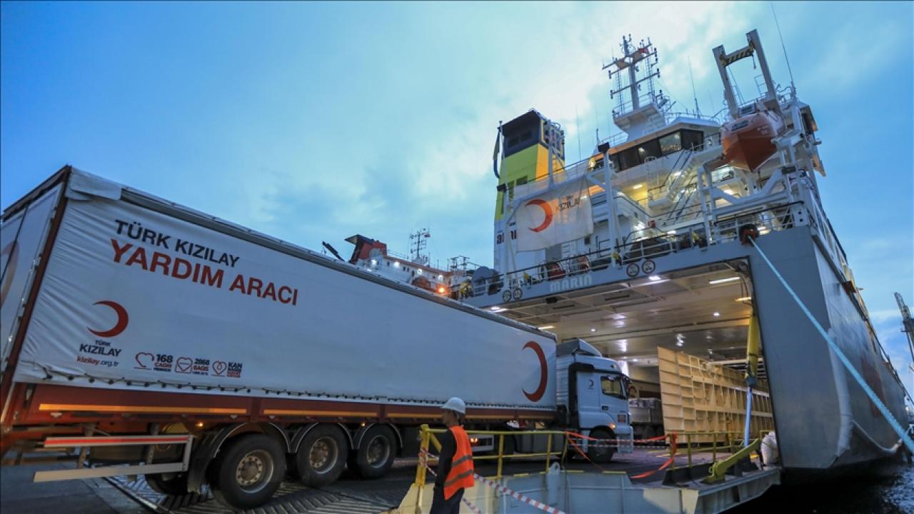 “İyilik Gemileri” adı verilen gemilerle Mersin Limanı’ndan Mısır’ın El-Ariş Limanı’na ulaştırılan gıda, su, hijyen, tıbbi ekipman ve barınma gereçleri gibi tonlarca malzeme, kara yoluyla Gazze’ye sevk ediliyor.
