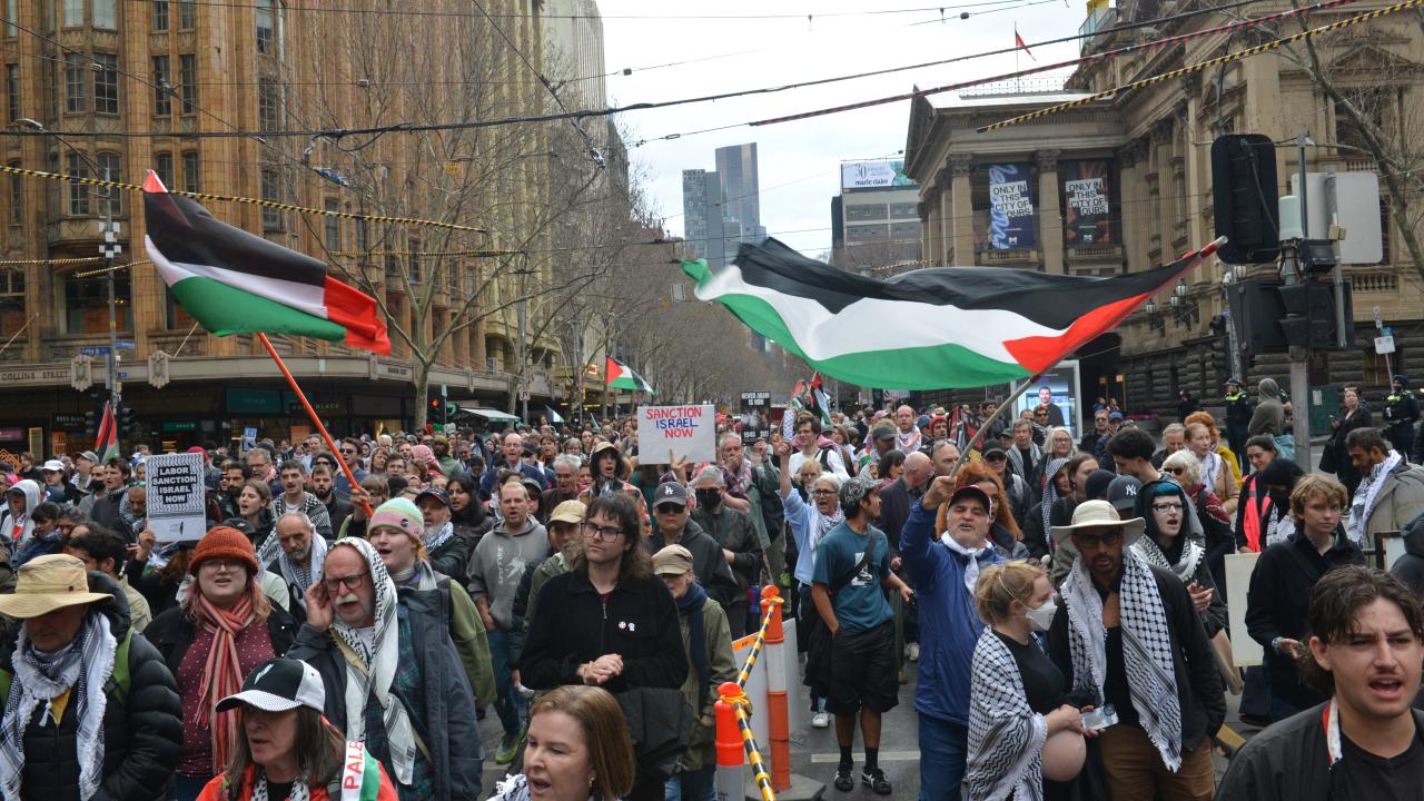 Melbourne’de Victoria Eyalet Kütüphanesi önünde toplanan göstericiler, Avustralya hükümetine çağrıda bulunarak, İsrail ile diplomatik ve ticari ilişkilerin kesilmesini, İsrail’e silah satışının durdurulmasını ve Gazze’ye yönelik saldırıların son bulması için somut adımlar atılmasını istedi.