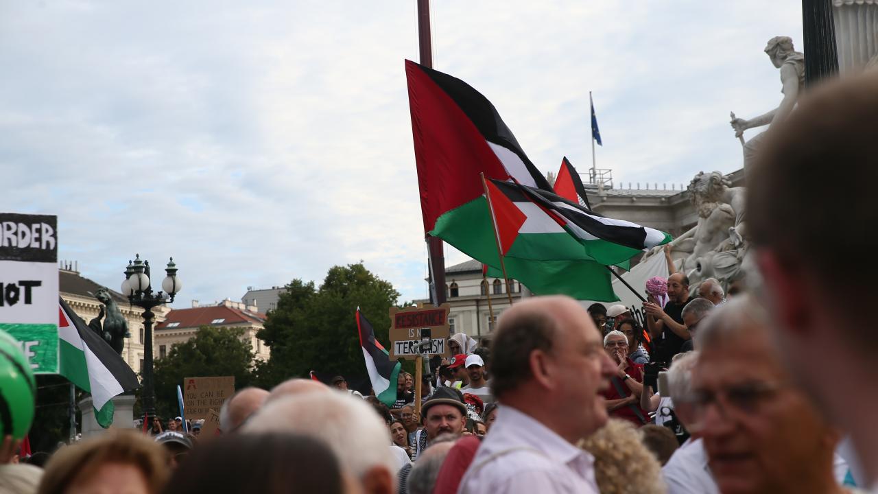 Filistin bayrakları taşıyan göstericiler, Avusturya hükümetini Gazze’de işlenen soykırıma ortak olmakla suçladı.