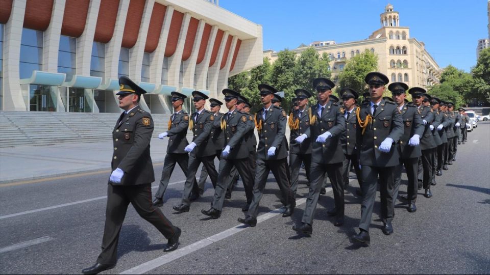 Azerbaycan’da Harp Okulu öğrencileri ve subaylar, şehrin merkezi cadde ve sokaklarında yürüyüş yaparken Azerbaycan Savunma Bakanlığına bağlı askeri bando ekibi, seslendirdiği marşlarla geçide eşlik etti.