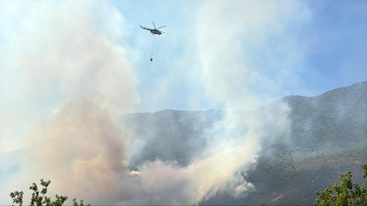 Alevler ve duman geniş alanda etkili olurken, yangının söndürülmesi için havadan ve karadan başlatılan çalışma sürüyor.