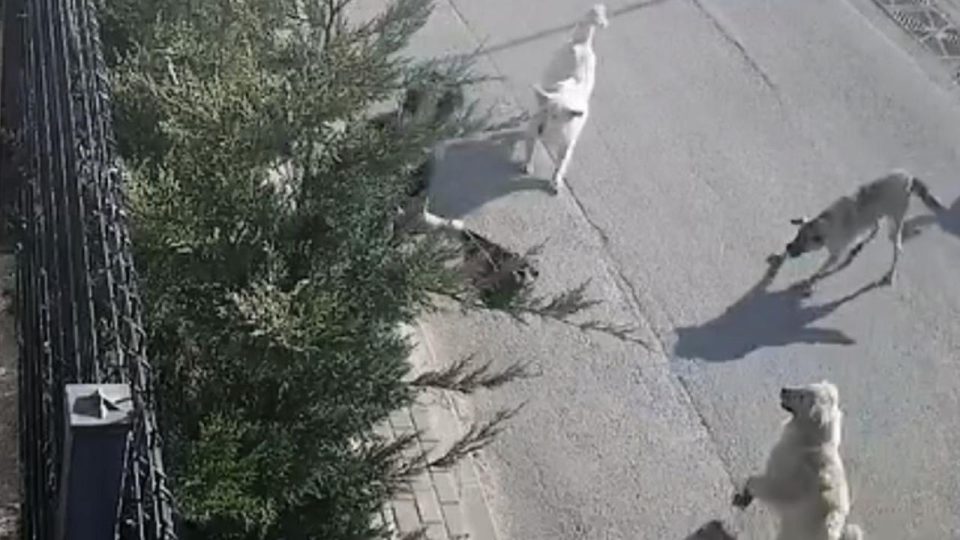 Çantasıyla köpekleri uzaklaştırmaya çalışan Kuloğlu, bacağından hafif şekilde yaralandı. O anlar, çevredeki bir iş yerinin güvenlik kamerasınca kaydedildi.