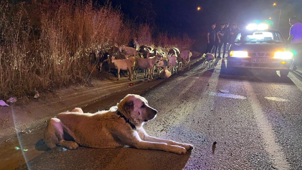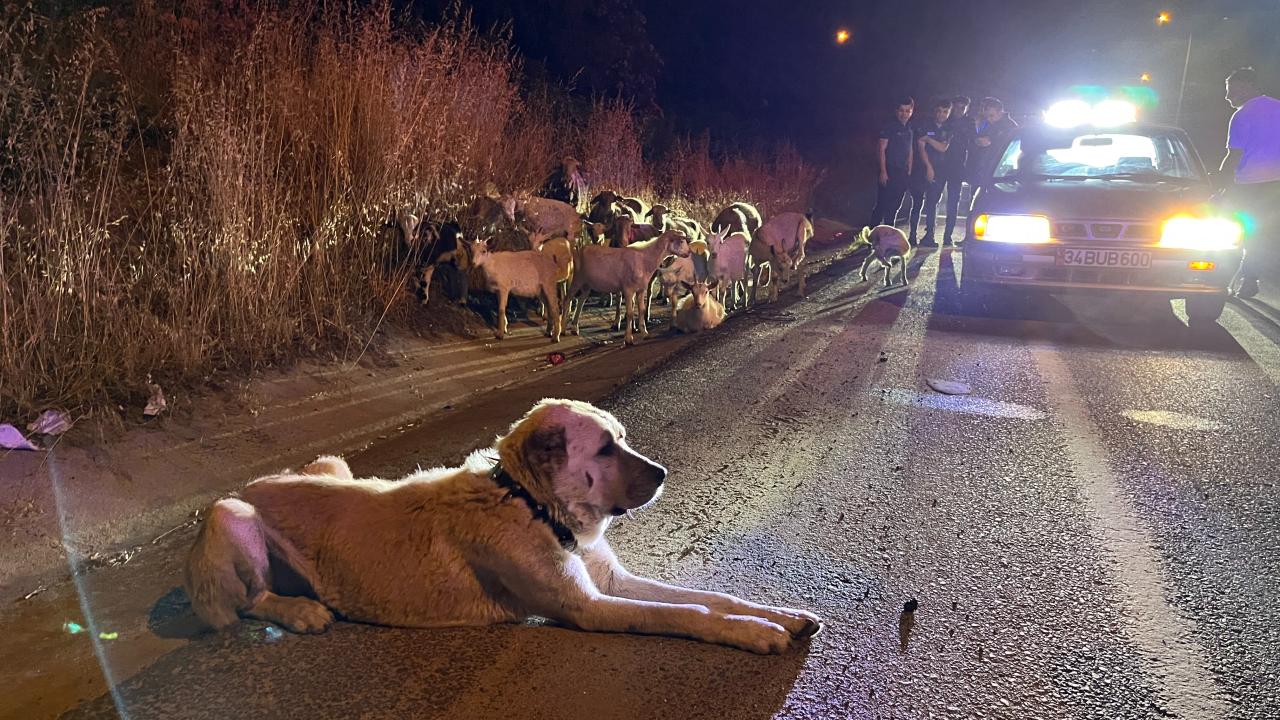 Keçilerin çevre yolunda görüldüğü ihbarları üzerine bölgeye giden çok sayıda polis ekibi keçileri ve başlarında bekleyen çoban köpeğini Esentepe Mahallesi Çorlu Çevre Yolu üzerinde buldu.