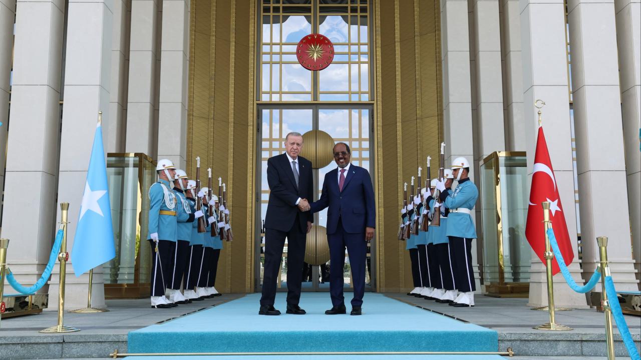 Cumhurbaşkanı Erdoğan, Mahmud’u Cumhurbaşkanlığı Külliyesi girişinde karşıladı, merdivenlerde Türk ve Somali bayrakları önünde fotoğraf çektirdi.
