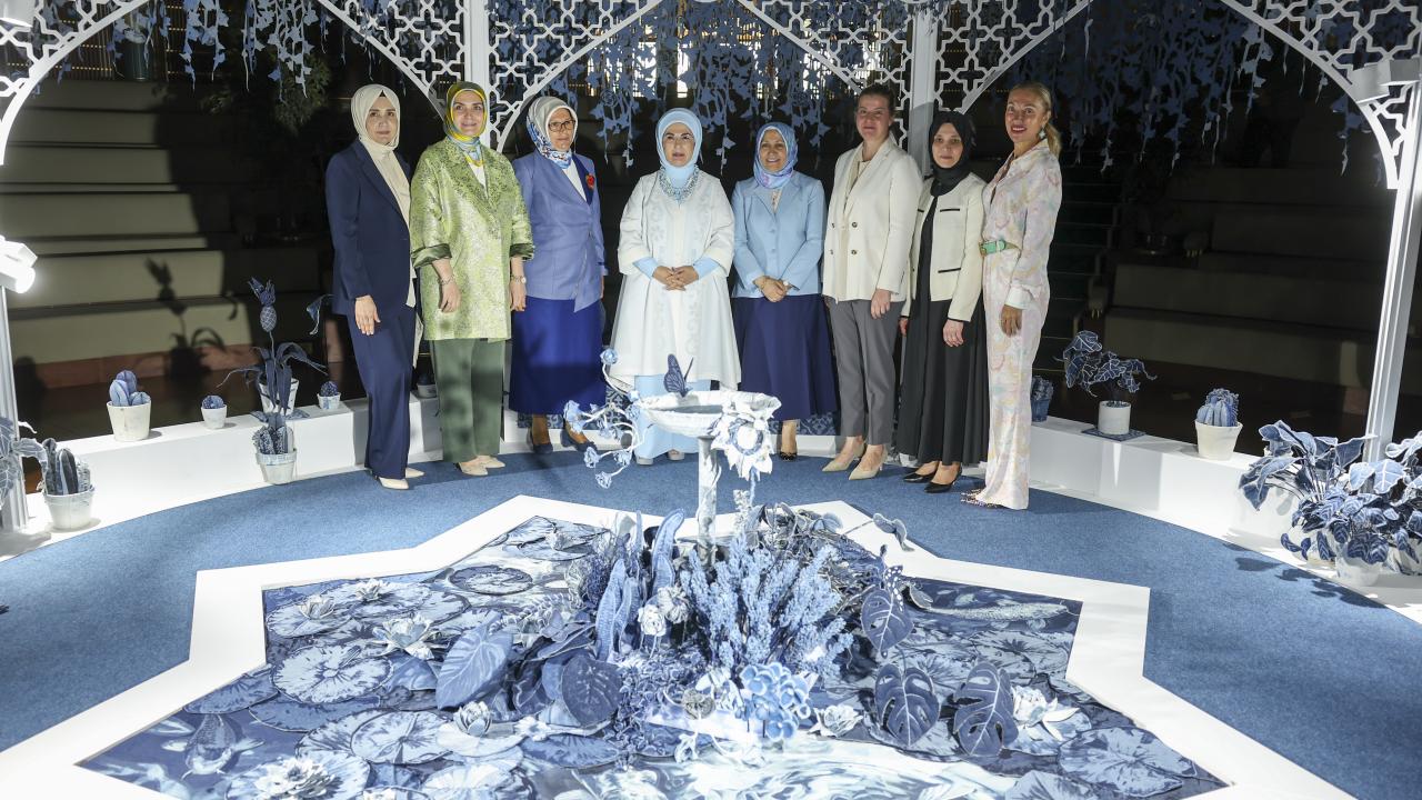 Emine Erdoğan, sanatçının 15. yüzyıl İznik çinilerinden ilham alarak oluşturduğu “Çini Çiçekleri” isimli çalışmasının bir kısmına çiçek deseni yapıştırarak sanatı tecrübe etti.