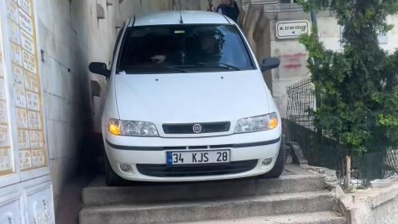 Eyüpsultan’da gideceği yolu karıştıran sürücünün otomobiliyle merdivenlerden inmeye çalışması cep telefonuyla kaydedildi.