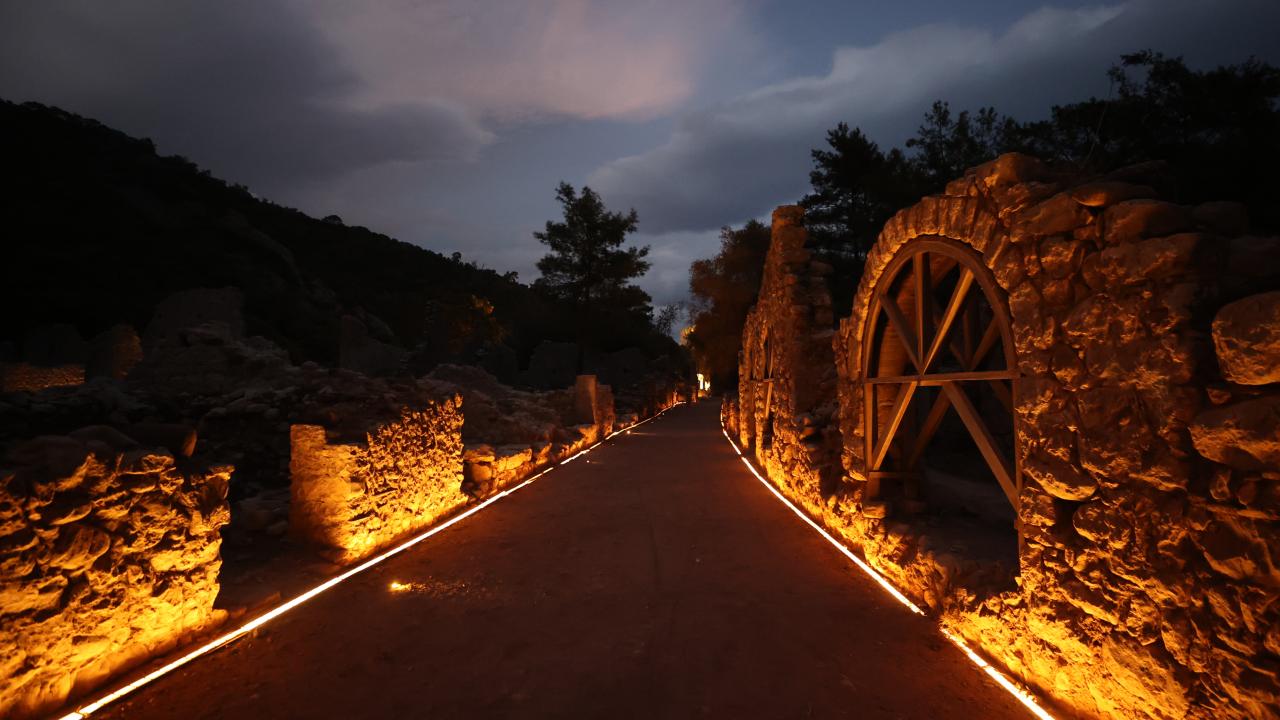 Gece müzeciliğinin uygulandığı kentlerden olan Olympos’ta da ışıklandırma çalışmalarıyla akşam saatlerinde de ziyaretçi ağırlanmaya başlandı.