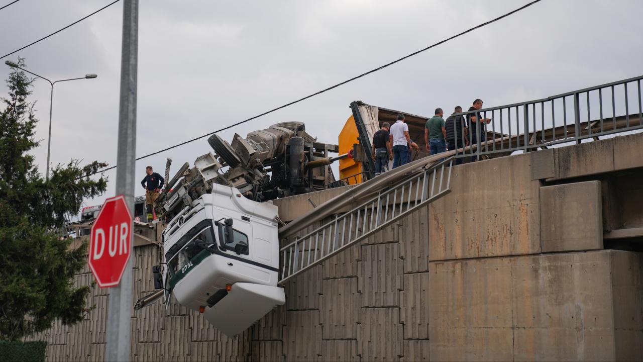 İ.Ö. idaresindeki tır, Ankara Caddesi 4. Sanayi Kavşağı’nda seyir halindeyken sürücüsünün kontrolünü kaybetmesi sonucu devrildi. Sürüklenen tır, viyadükte asılı kaldı.