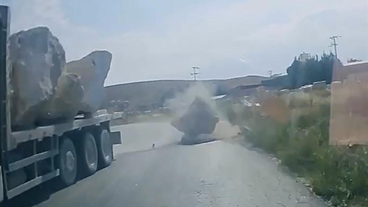 Bu esnada karşı yönden gelen otomobilin sürücüsü, yola düşen mermer bloğunu fark ederek ani fren yaptı. Sürücünün dikkati sayesinde olası bir facia önlenirken, o anlar otomobilin araç içi kamerasına saniye saniye yansıdı.