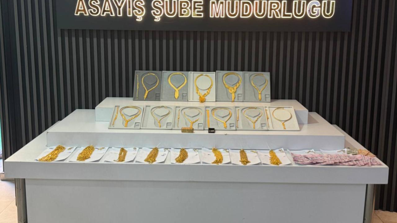 Çeşitli suçlardan 7 kaydı bulunan B.A.’nın aracında ele geçirilen 96 altın kolyenin yanı sıra sahte olduğu belirlenen 1 külçe altın, 6 künye, 11 kolye, 10 çift küpe, 27 pırlanta taş ile 9 bin 970 lira emniyette sergilendi.