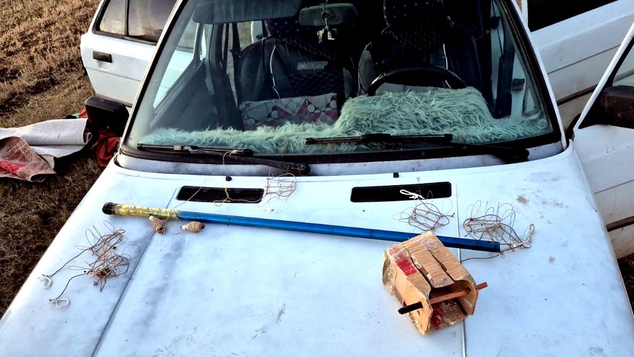 Yapılan aramada, 3 canlı kızıl şahin,10 güvercin ve çeşitli yakalama aparatları ele geçirildi. Ayrıca bir otomobile de el konuldu.