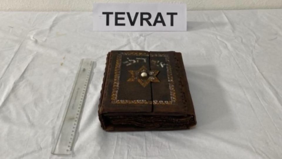 Araçta yapılan aramada, yaklaşık 700 yıllık olduğu değerlendirilen, üzeri ve içi desen sembol işlemeli deri üzerine el yazması Tevrat bulundu.