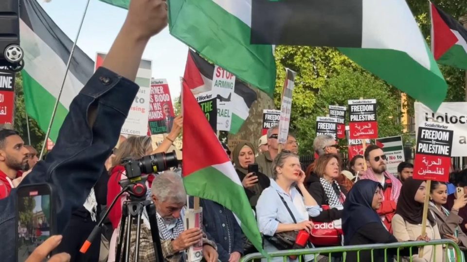 Başbakanlık Ofisi 10 Numara’nın bulunduğu Downing Sokağı’nda toplanan Filistin destekçisi göstericiler, Gazze’de soykırım sürerken İngiltere’nin İsrail’e silah satışını protesto etti.