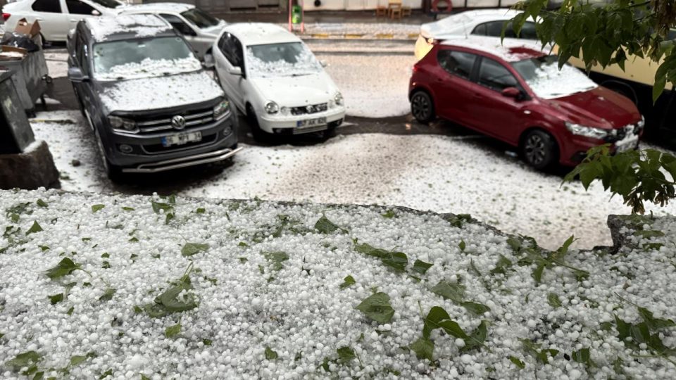 Kısa süreli yağışın ardından etraf beyaza büründü, park halindeki araçların üzeri dolu taneleriyle kaplandı.