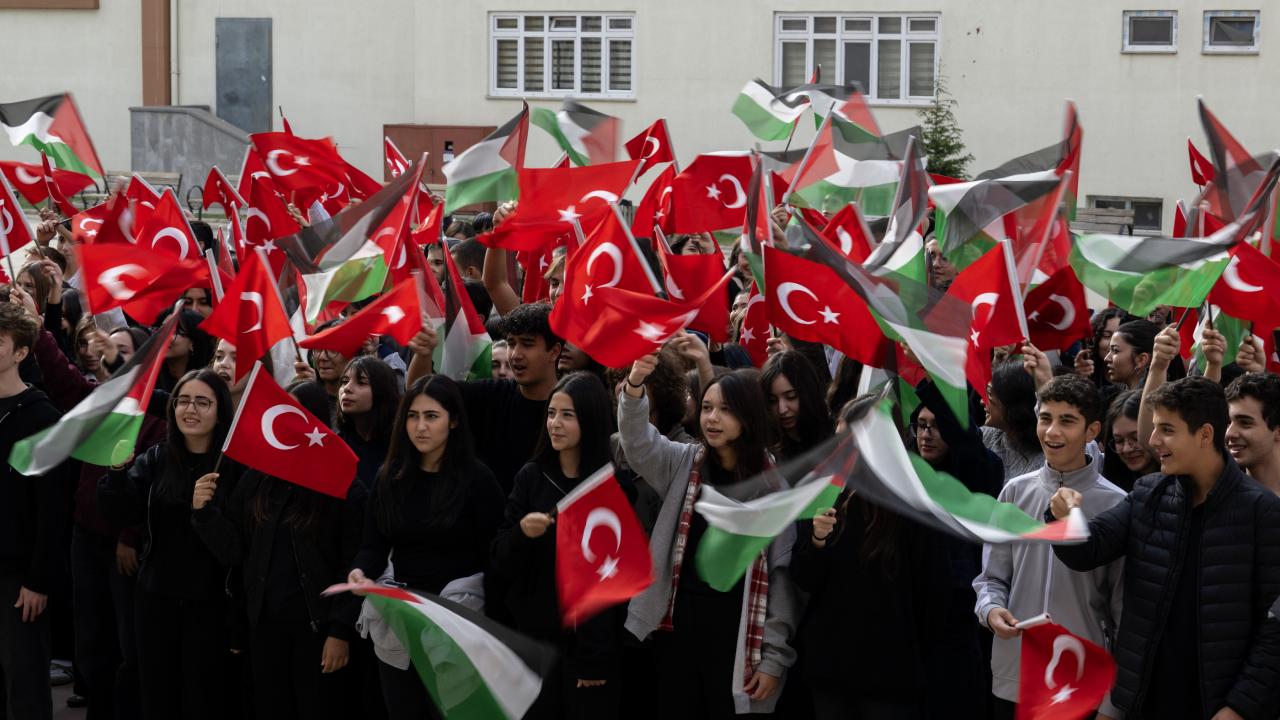 Ellerinde Filistin ve Türk bayrakları sallayan öğrenciler, hep bir ağızdan “Çocuklar ölürken sessiz kalınmaz”, “Nehirden denize özgür Filistin”, “Katil İsrail, Gazze’den defol” sloganları attı.