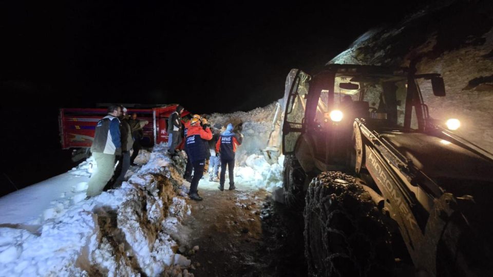 Yolda seyir halinde bulunan ve içinde hayvanların da yer aldığı bir kamyonet, çığ çarpması sonucu uçurumun kıyısında askıda kaldı.