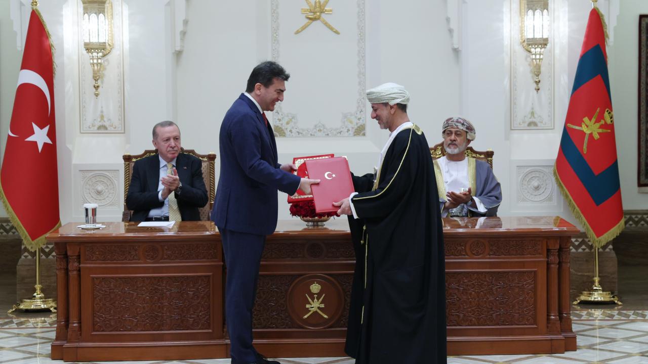 Cumhurbaşkanı Recep Tayyip Erdoğan ile Umman Sultanı Heysem bin Tarık’ın Al Alam Sarayı’nda başkanlık ettiği heyetler arası görüşmenin ardından iki ülke arasındaki anlaşmaların imza törenine geçildi.