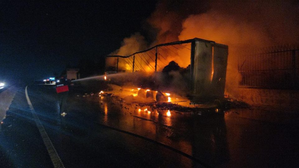 Yalova-Kocaeli kara yolunun Çiftlikköy ilçesi yakınlarında, seyir halindeki konserve yüklü tırın dorsesinde henüz belirlenemeyen nedenle yangın çıktı.