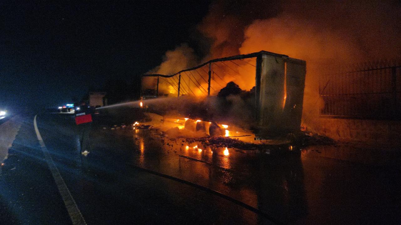 Alevleri fark eden sürücü, aracı emniyet şeridine çekerek çekiciyi dorseden ayırdı.